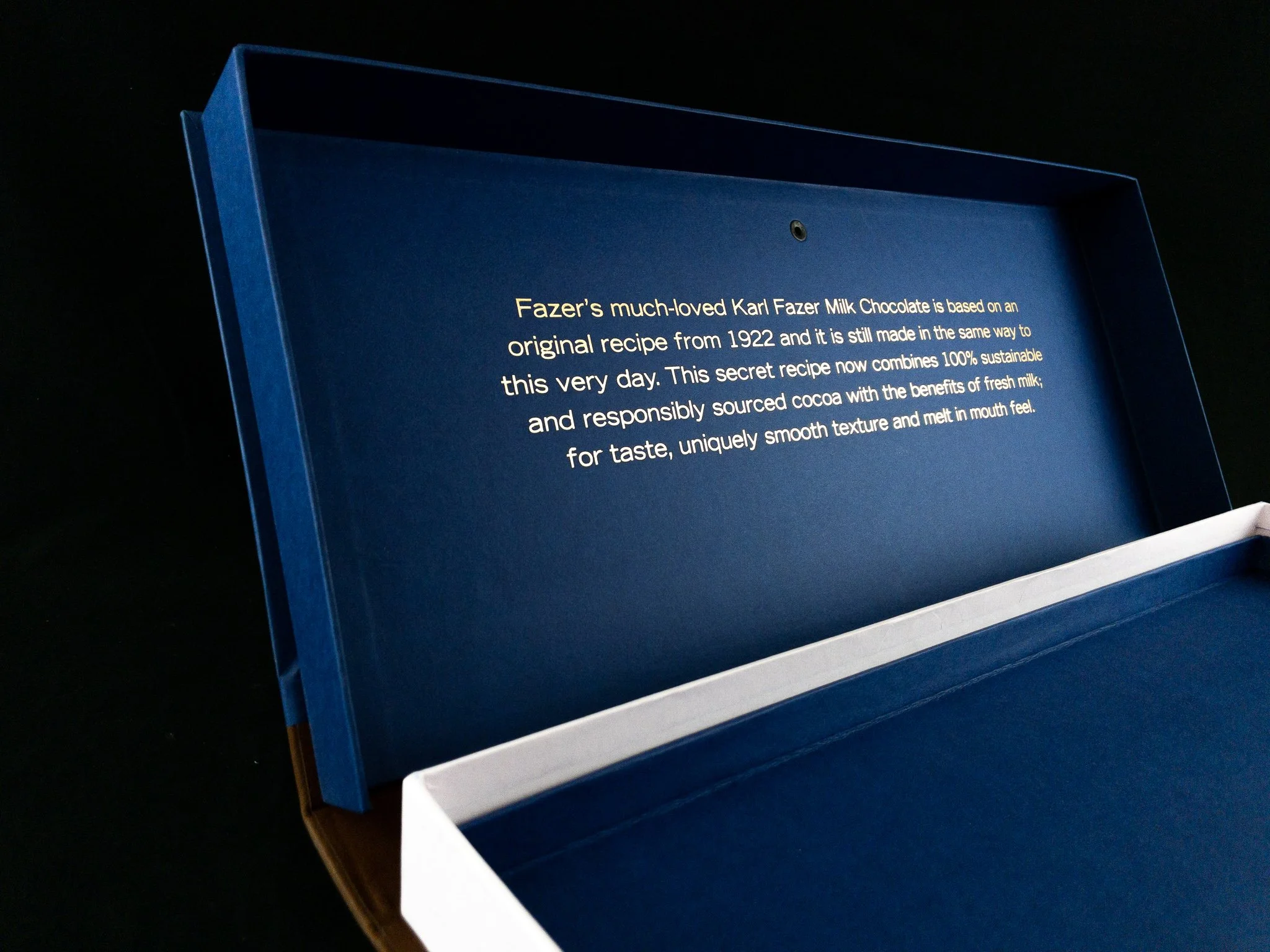 Karl Fazer Clamshell boxPotahovaná krabičkaWibalinKůžeBox na čokoláduZlatá ražbaDebossObal na produkt Aug 22 Written By Martin Patera Martin Patera